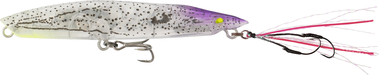 The Samaki Redic Skipping Prawn is a floating surface lure designed for a dynamic skipping ‘walk-the-dog’ action on the retrieve. Its prawn-like profile mimics fleeing prey, making it a deadly choice for surface-feeding predators. Fitted with a Decoy Y-S25 treble hook on the belly and custom-made Decoy twin assist hooks on the rear, it ensures solid hook-ups on even the most timid bites. Suitable for both fresh and saltwater fishing.
