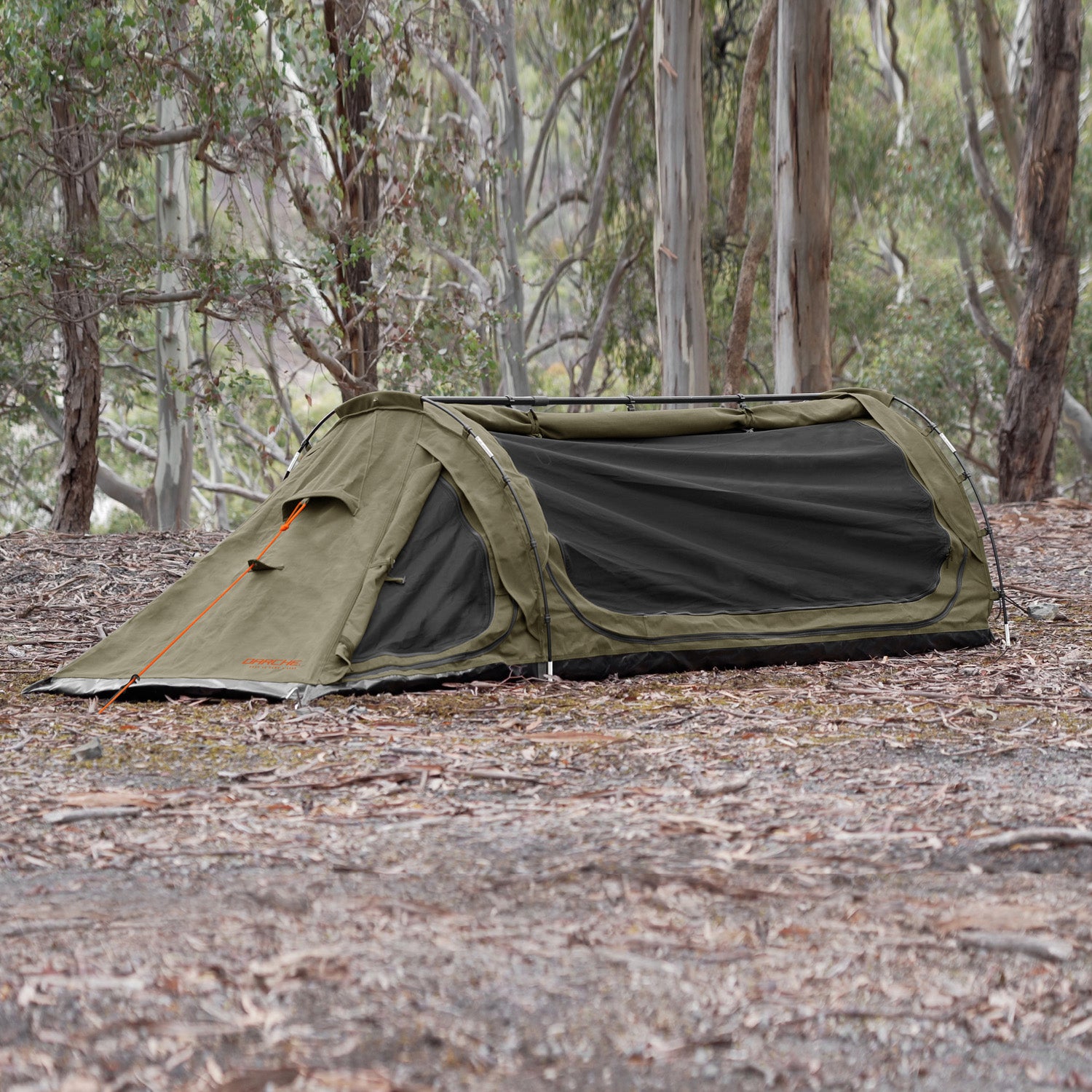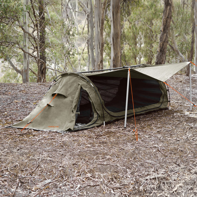 With two massive super-fine mesh doors and a zip down ventilation window with storm flap, this swag has unparalleled ventilation, keeping you cool while ensuring you’re well protected from the elements all year round. The canvas storm covers can either be rolled up or converted to awnings, giving you extra shade and protection in all weather conditions.