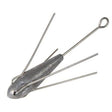 This clever sinker design offers anglers an aerodynamic shape that is excellent for maximising casting distance while also providing good bottom grip with four wire prongs. These prongs can then free the weight from its holding position as the wires "break away", folding back, when a fish strikes or the angler winds in. Breakaway sinkers are popular with beach and rock anglers fishing areas with high water movement and/or areas with seafloors that can cause other sinker shapes to snag on obstructions.